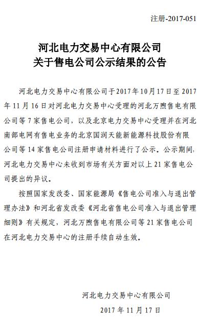 11月17日,河北電力交易中心發(fā)布了《關(guān)于售電公司公示結(jié)果的公告》,公告稱10月17日至11月16日,河北電力交易中心受理河北萬煦售電有限公司等7家售電公司,以及北京電力交易中心受理并在河北南部電網(wǎng)有售電業(yè)務(wù)的北京國潤天能新能源科技股份有限公司等14家售電公司注冊申請材料進行了公示,公示期間未收到異議,這21家售電公司注冊手續(xù)自動生效。